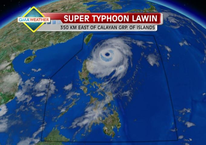 PAGASA's 5 a.m. advisory indicated Lawin was 350 km east of Calayan Islands as of 4 a.m., with maximum sustained winds of 205 kph near the center and gustiness of up 240 kph.