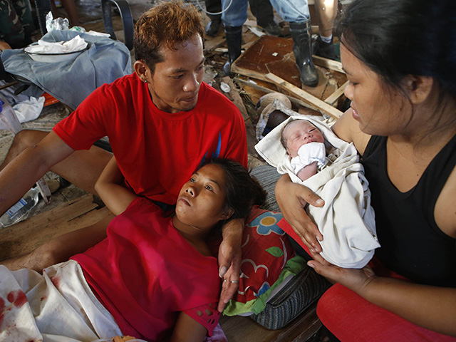 A woman holds newly born baby Beatriz as her mother (not pictured) recuperates at a makeshift birthing clinic in Tacloban city in central Philippines November 11, 2013. Dazed survivors of super Typhoon Haiyan that swept through the central Philippines killing an estimated 10,000 people begged for help and scavenged for food, water and medicine on Monday, threatening to overwhelm military and rescue resources.