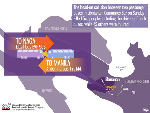 A head-on collision between two passenger buses in Libmanan town in Camarines Sur early Sunday morning left five people dead and 45 others injured, town police said.