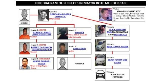 Police Regional Office 3 director Chief Superintendent Amador Corpus presented the diagram of suspects in the killing of Bote with a certain Christian Saquilabon identified as the mastermind.