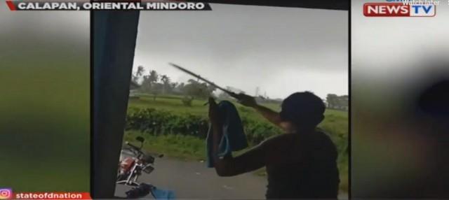 One man, however, did the opposite and rushed out of their house, wielding a gulok or a large bolo knife. As the tornado —at a distance— destroyed everything on its path, the man started waving his weapon into the air in a hacking motion.