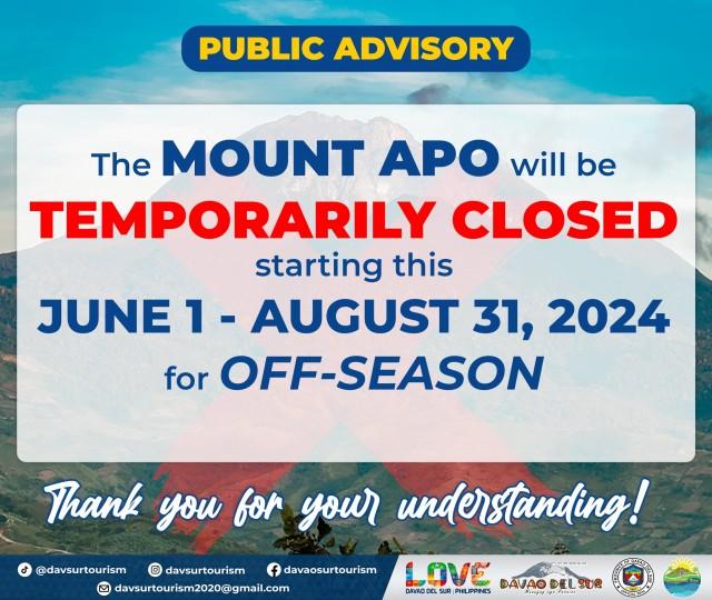 Mt. Apo in Davao del Sur will be temporarily off-limits to the public from June 1 to August 31, according to local authorities.