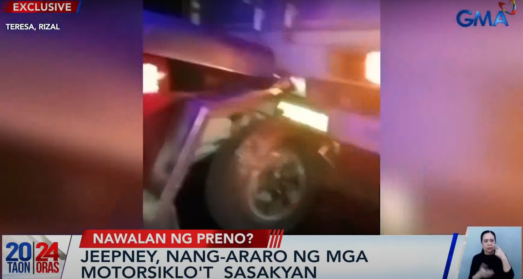 In EJ Gomez’s exclusive report in 24 Oras on Monday, authorities said the jeepney with its 42-year-old driver behind the wheel collided with two motorcycles and then an L300 van before hitting a car in Barangay May-Iba.