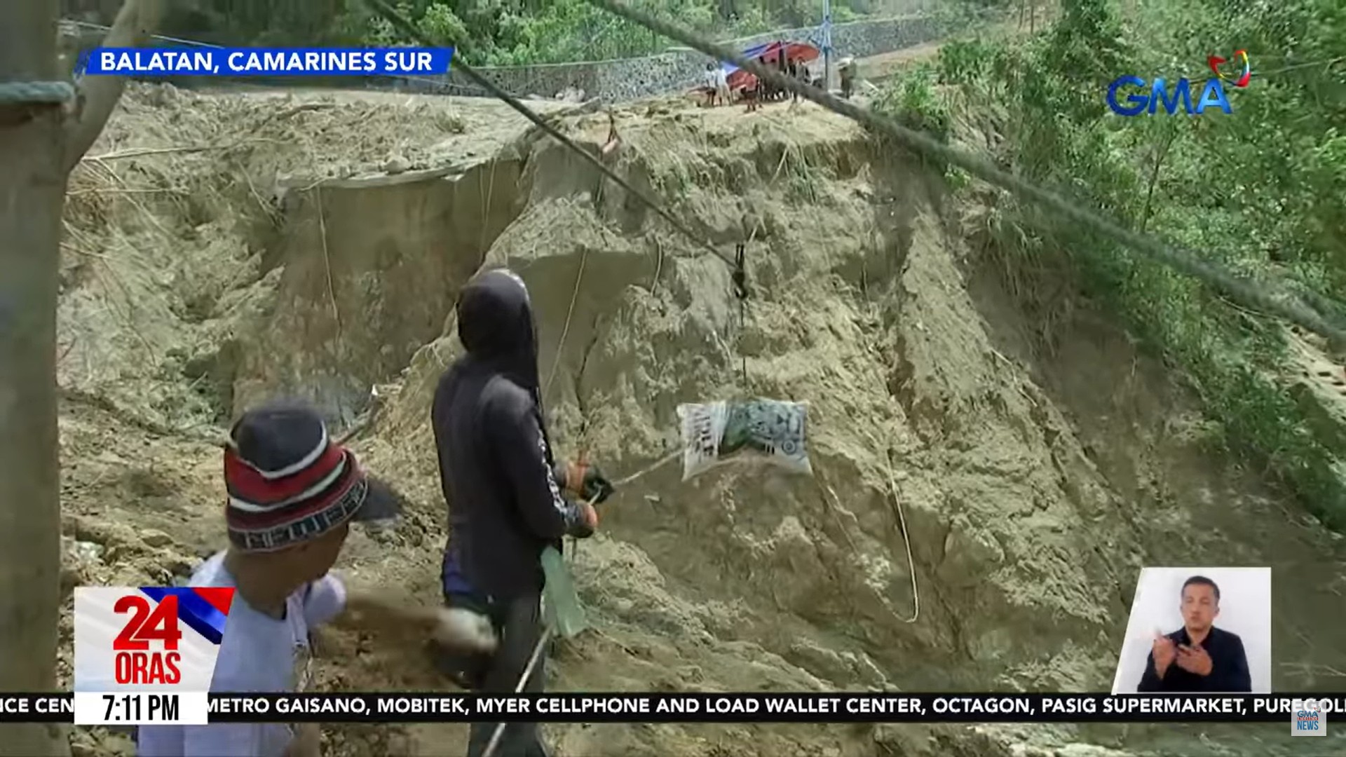 Essential supplies are being delivered via zipline to calamity-hit residents of Balatan in Camarines Sur after Severe Tropical Storm Kristine caused landslides that rendered roads impassable, according to Ian Cruz’s report in 24 Oras on Wednesday.