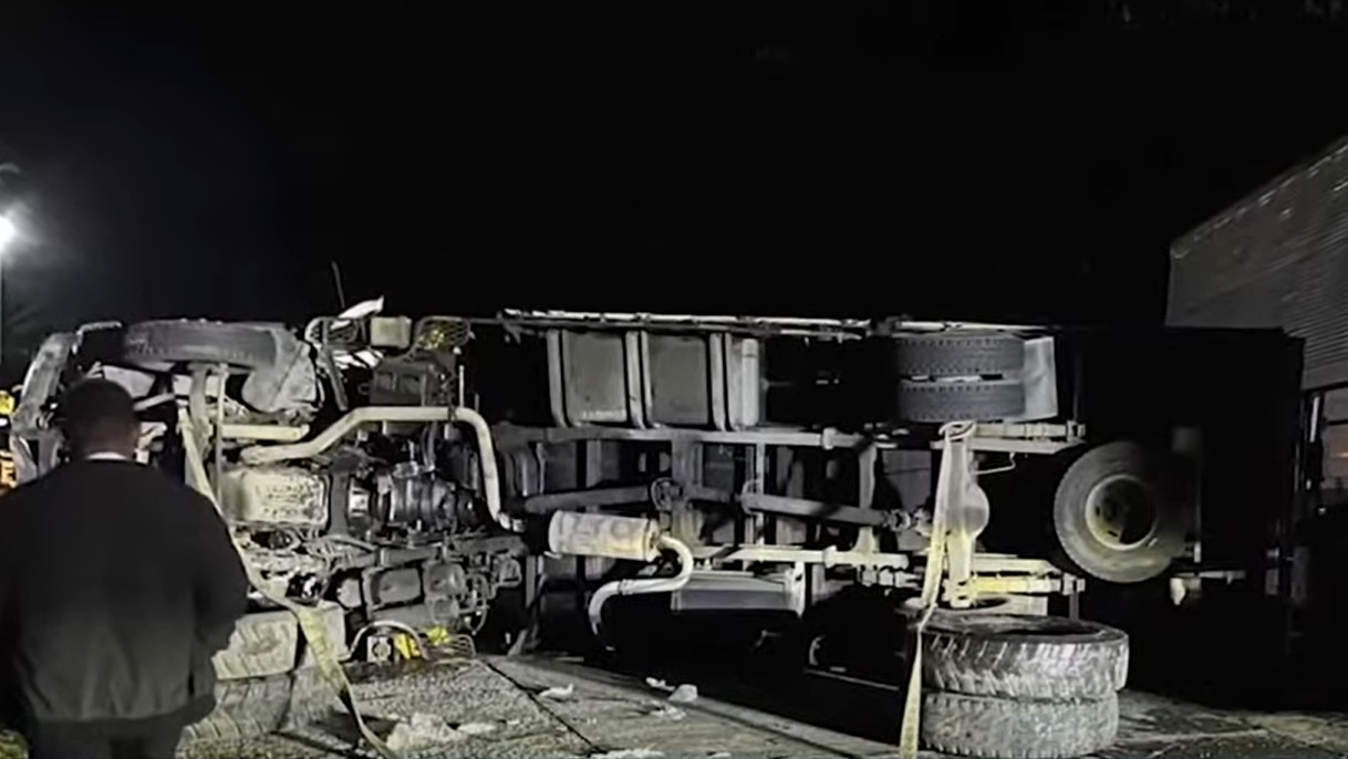 It took almost four hours before authorities were able to tow away the heavily damaged trucks.