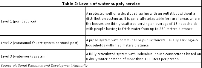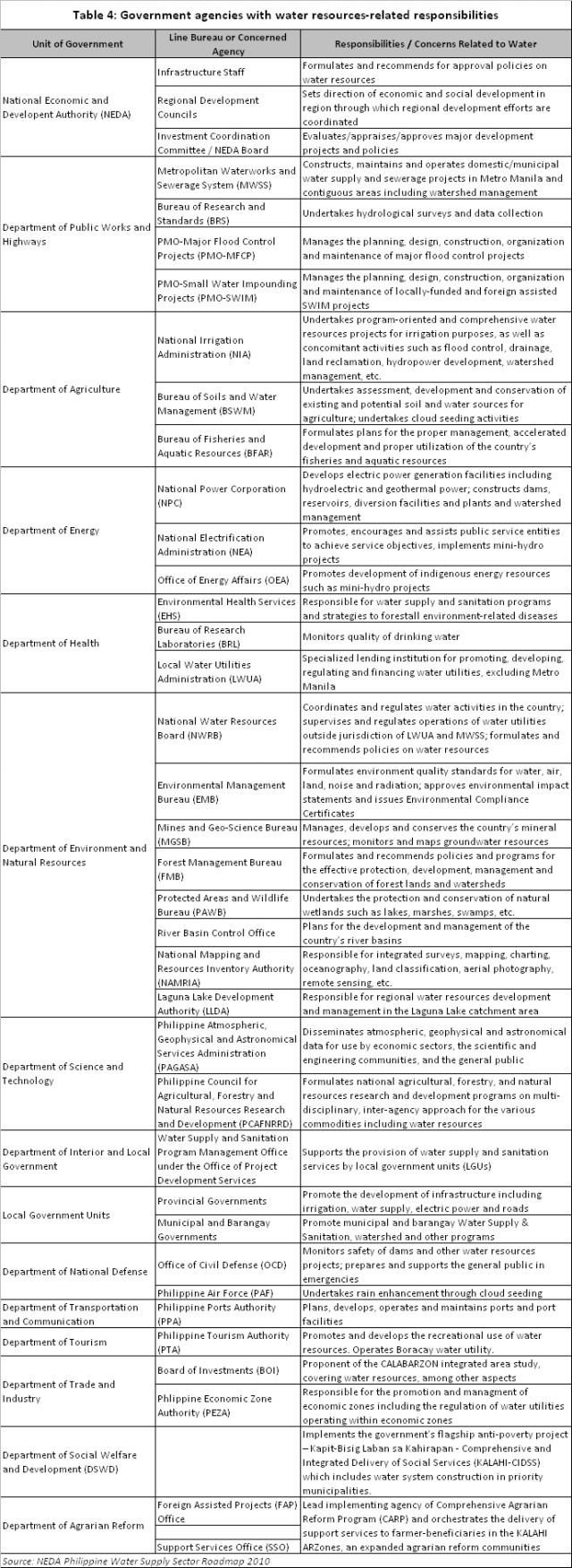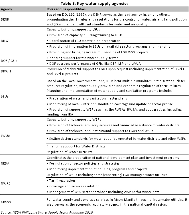 In its water supply roadmap report in 2010, the National Economic and Development Authority (NEDA) has identified more than 30 agencies, with the observation that the “existing structures have different regulatory practices, processes and fees with cases of overlapping functions or jurisdictions. This environment suggests a fragmented regulatory framework and lack of coordination."