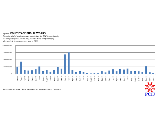 The PCIJ review of DPWH data on awarded contracts show that the total value of awarded civil works contracts entered in the agency’s public works registry began to go up toward the end of 2011 after sharply declining in the second half of 2010.