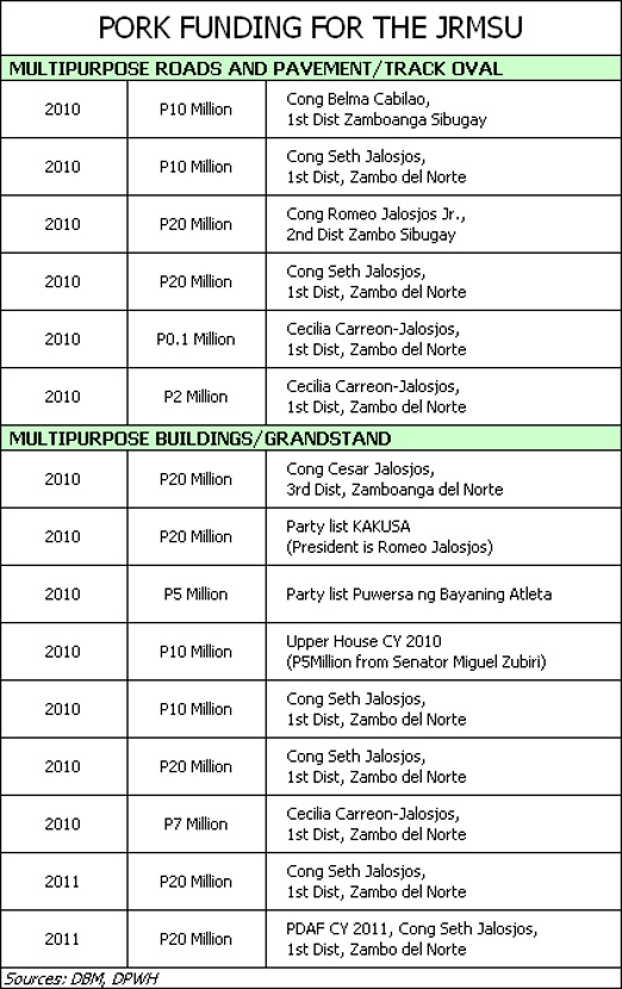 Pork for the sports complex At the JRMSU in Dapitan City, Rep. Seth Jalosjos has the goodwill of both students and faculty. DPWH and DBM records show that Rep. Jalosjos gave the most pork funds to the JRMSU sports complex among all the legislators who contributed, at least P100 million. The rest of the P194-million pork allocation for the project was made by other representatives and a senator. The amount does not yet include funds donated by the different local government units and other government agencies. In the pork database culled from DBM and DPWH records, at least P132 million was earmarked for an “MPB” inside the state university. The “MPBs” constructed were, in fact, grandstands for the sports complex. The P62.1-million pork allocation for “multi-purpose pavement” turns out to be for the track oval of the sports complex. Rep. Cesar Jalosjos of the third district of Zamboanga del Norte, uncle of Seth, gave at least P20 million of his pork to the sports complex. Rep. Cecilia Jalosjos, Cesar’s sister and Seth’s aunt, contributed almost P10 million from her pork barrel. Seth succeeded Cecilia as first district representative in 2010. “This is now the pride of Zamboanga del Norte. To have a national level of arena for competition, hosting Palarong Pambansa or athletics nationwide,” Rep. Cesar Jalosjos says in an interview with GMA News.
