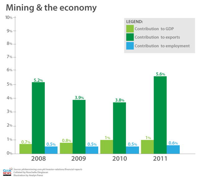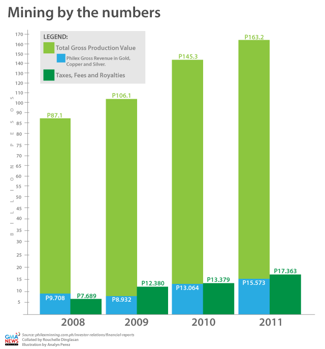 Philex website. The temporary closure of the Padcal mines has taken its toll on the economy, as the country’s metallic mineral production value dropped by 18.85 percent in the third quarter of 2012 to P79.52 billion compared to the same period in 2011, the MGB reported in December. According to the bureau, the lackluster performance of the mining industry was due to the suspension of Philex’s Padcal Mine and three other mining firms: Nonoc Nickel Project of Shuley Mines Inc. - Pacific Nickel Philippines Inc. in Surigao Del Norte, which has unsettled obligations with the government; Leyte Magnetite Sand Project of Leyte Irons and Corporation in Leyte Province, which leaked mine wastes to Lake Bito; and the Paracale Gold Project of Johson Gold Mining Corporation in Camarines Norte, which needs to repair its facility including its wastes pond. From January to June last year, Philex Mining was the second largest gold producer in the country with about P4 billion worth of gold output, more than a quarter of the entire national output, according to the MGB. Philex also produced P3.27 billion worth of copper, or about one third of the total national production, for the first half of 2012. Moreover, the Padcal mine was the fifth largest silver producer during the first half of the year, its output worth P75.5 million. According to Philex Mining’s annual report in 2011, Padcal Mine still has a total of 2.2 million ounces of gold mineral reserves worth about $3.7 billion, and 760 million pounds of copper. It employs 2,126 people and covers 13,729 hectares within the municipalities of Itogon and Tuba in Benguet. “Sa P100 million na budget [ng Tuba], 20 percent galing sa Philex at P79 million mula sa internal revenue allotment,” Tuba Mayor Florencio Bentrez said in a telephone interview. In Itogon, Mayor Oscar Camantiles was quoted by an independent fact-finding mission as saying that