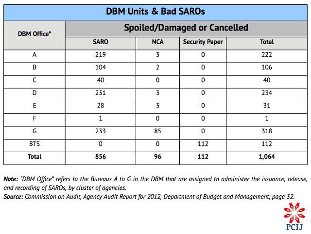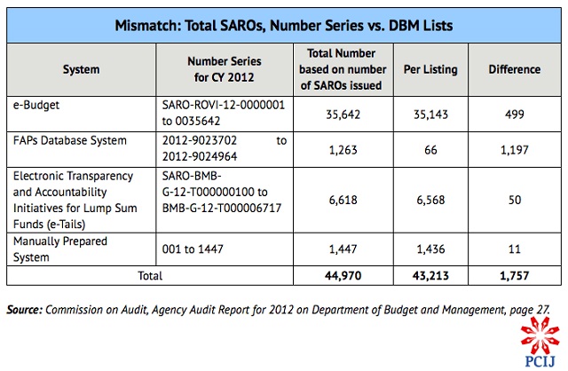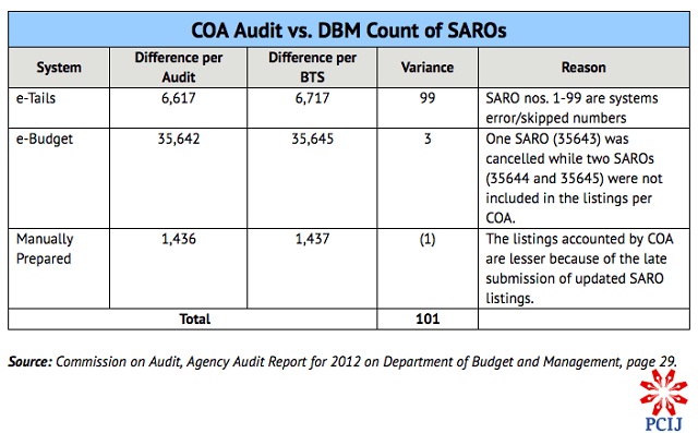 In its 2011 audit report on DBM, COA had noted that up to 3,158 SAROs were unaccounted for, bore the same number, or had skipped numbers.