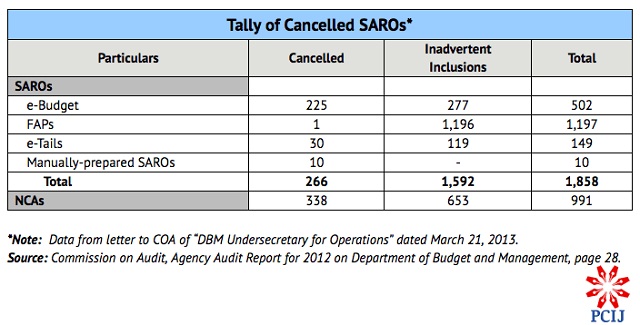 For the year 2012, COA reported that DBM’s Budget Technical Service (BTS) disclosed that there were 44,970 SAROs with total amount of P1,076,236,898,308.34 (or P1.07 trillion) and 51,758 NCAs worth a total of P1,370,194,118,945.20 (or P1.37 trillion) that had been released under the four applications.