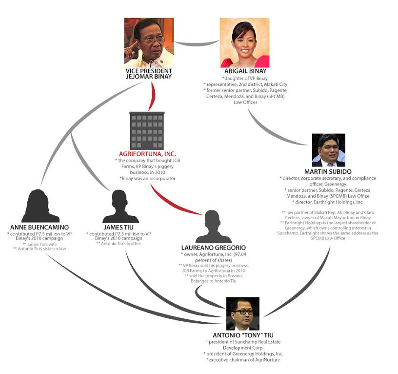 In a subsequent hearing, Senator Antonio Trillanes IV presented the Binays' connection to the Rosario farm, claiming the family's legal counsel, Martin Subido, is a dummy being used by the vice president, along with businessman Antonio Tiu: