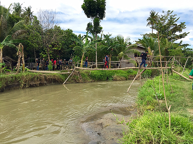 An MILF fighter ahead of them cocked his gun. To their right, he spotted a group of men with guns across the river. The fighter holding the two-way radio then made a quick call. The armed men across the river waved their hands. Friendly forces.