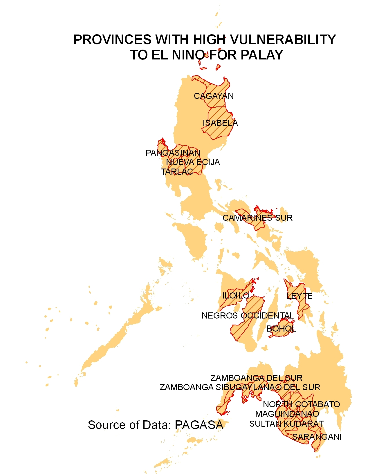 A PAGASA study (2009) identified the provinces with the highest vulnerability to El Niño—17 provinces for palay and 15 provinces for corn. Among these provinces, nine have high El Niño vulnerability for both crops—Isabela, Lanao del Sur, Leyte, Maguindanao, North Cotabato, Sarangani, Sultan Kudarat, Zamboanga del Sur and Zamboanga Sibugay. (refer to map)