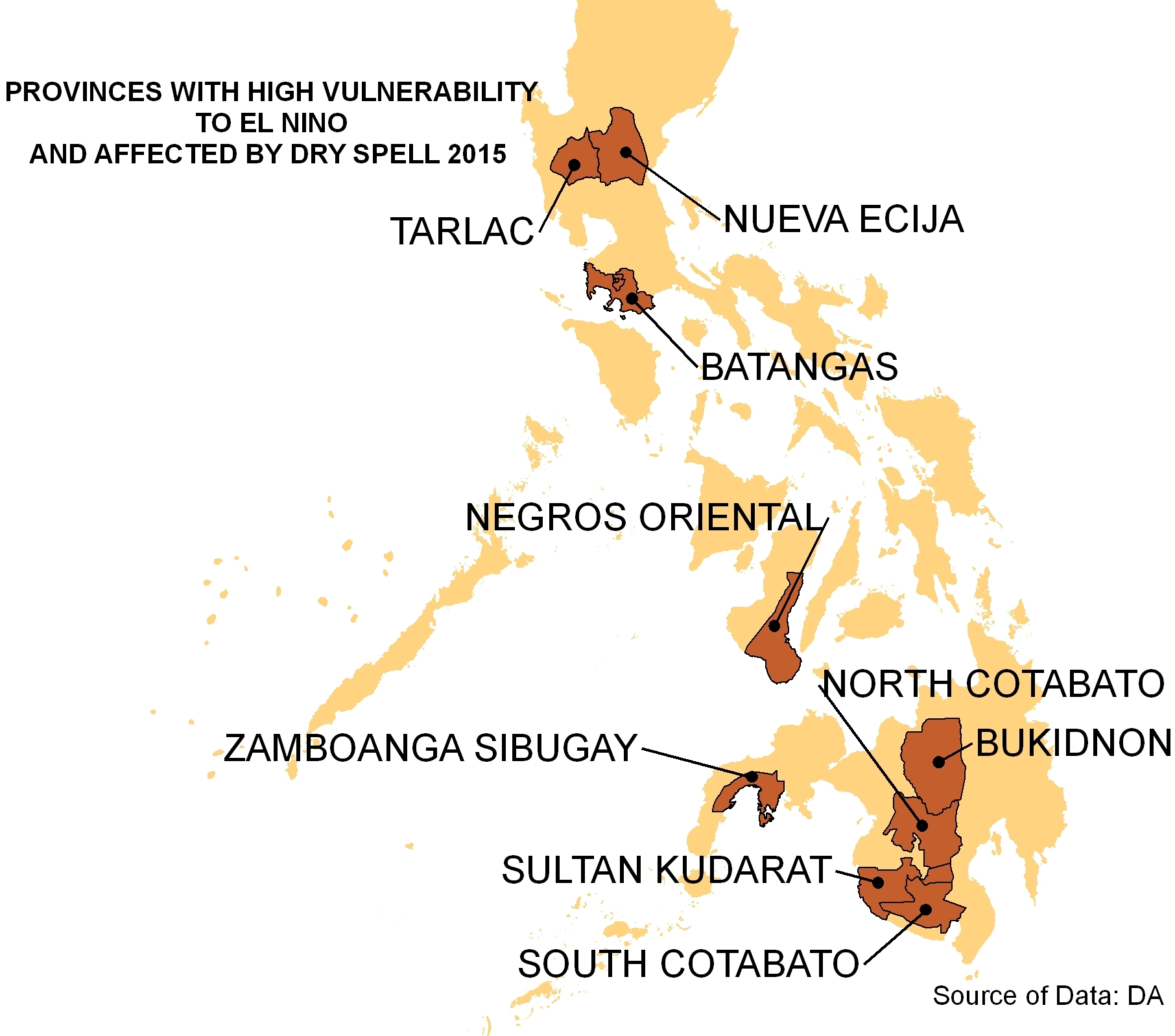 Of the 23 provinces with highest vulnerability, nine are feeling the effects of El Niño so far, based on DA’s monthly agricultural report from January to April 2015. These are Nueva Ecija, Tarlac, Batangas, North Cotabato, Zamboanga Sibugay, Sultan Kudarat, Negros Oriental, Bukidnon and South Cotabato. (see map)