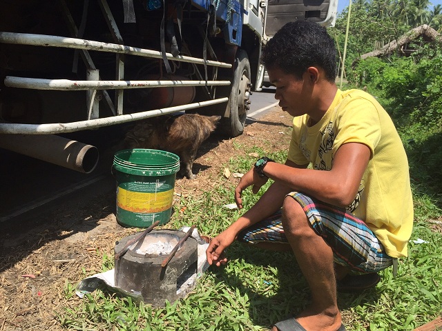 In all his years as a trucker's assistant or a pahinante, Rodel Delos Angeles says this has been his longest trip ever — 10 days on the road, and literally on the same road.