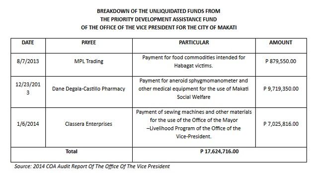 Aside from the food commodity for the Habagat victims, there are two other unliquidated disbursements noted by COA: P9.72 million paid to Dane Degala-Castillo Pharmacy for medical equipment to be used by the Makati Social Welfare Department - Senior Citizen Health Services Program, and P7.03 million paid to Classera Enterprises for the sewing machines allotted for the "livelihood Program of the Office of the Vice-President".