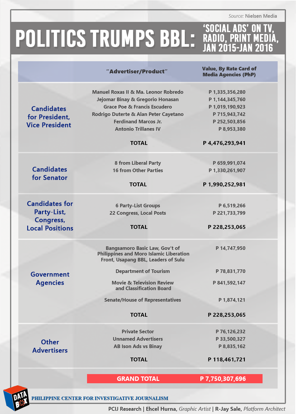 As a group, these candidates for national office accounted for P6.69 billion or 86.38 percent of the P7.75 billion in total “social concerns" ads purchased from TV, radio, and print media agencies, from January 2015 to January 31, 2016.