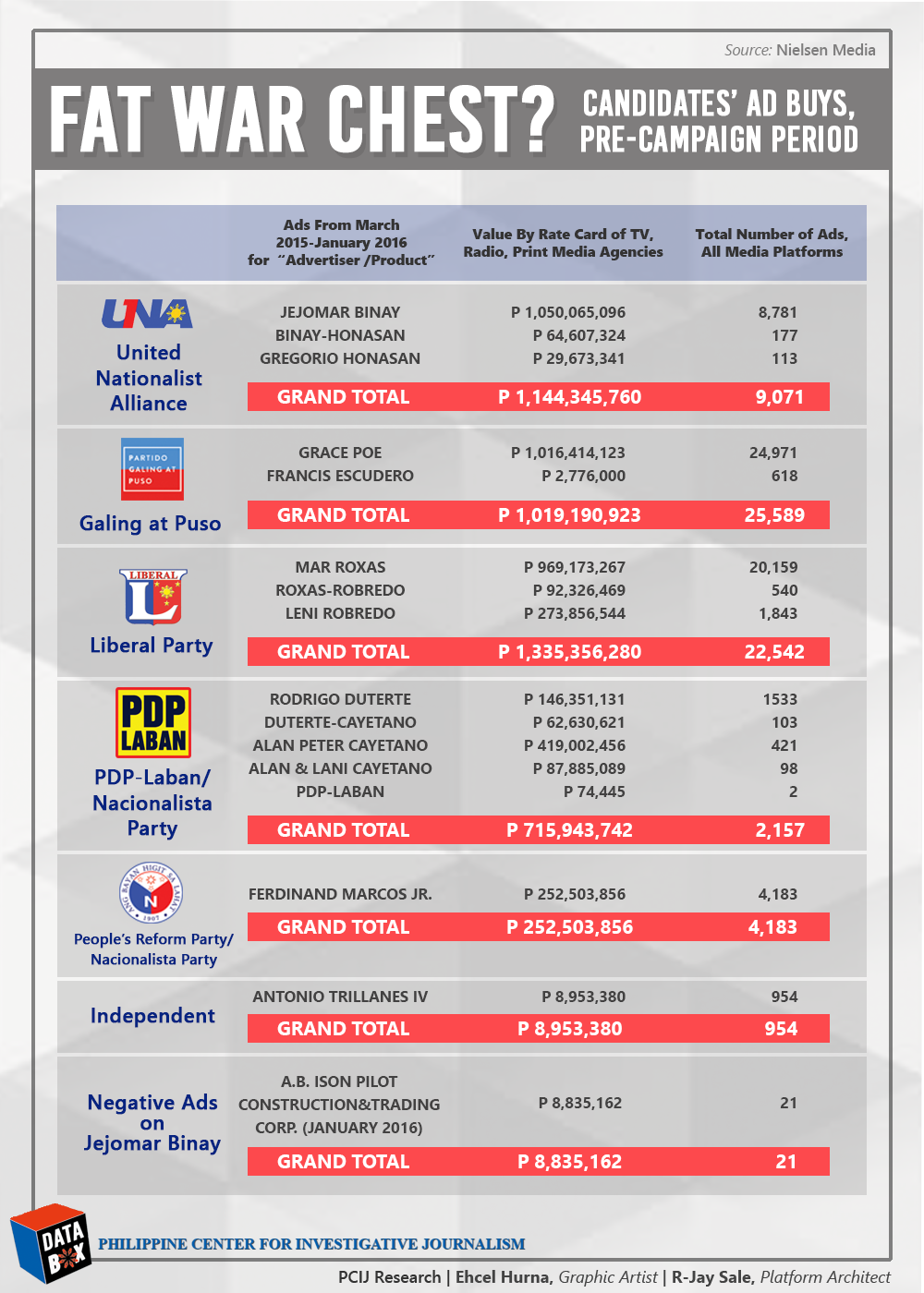 Binay's ads started airing in June 2015; in January 2016 alone, he placed ads worth P347,470,186, including P14,760,488 for radio ad spots.