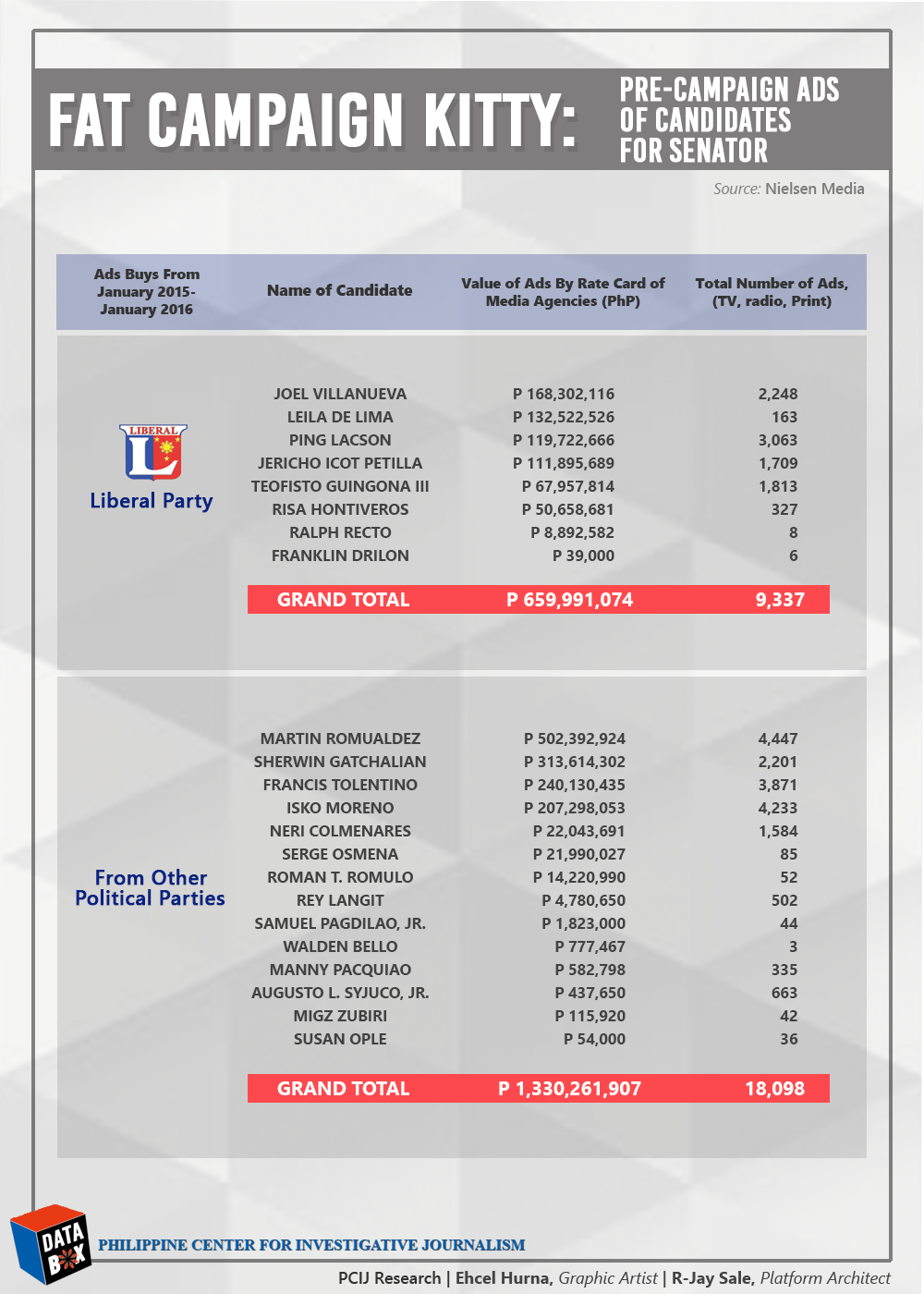 Fourteen candidates for senator from the other political parties also spent a total of P1.33 billion on pre-campaign ads during the period.