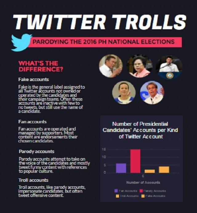 The first parody account dedicated to Duterte was created way back in December 2011. Poe’s official Twitter @SenGracePOE was created four years back, but one of her fake accounts @PoeGrace was created as early as 2009.