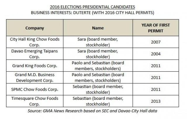 In Davao City, at least six companies registered with the SEC under the names of Duterte’s children—Sebastian, Davao City Vice Mayor Paolo and former mayor Sara -- have secured business permits for this year from the Davao City Hall.