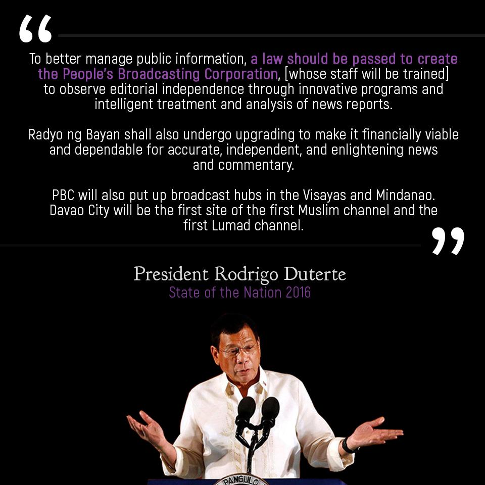 In promising the creation of the PBC—which would replace replacing state-run PTV-4—Duterte said that teams from international news agencies such as the BBC would visit the country to train the people who would staff the government-run channels.
