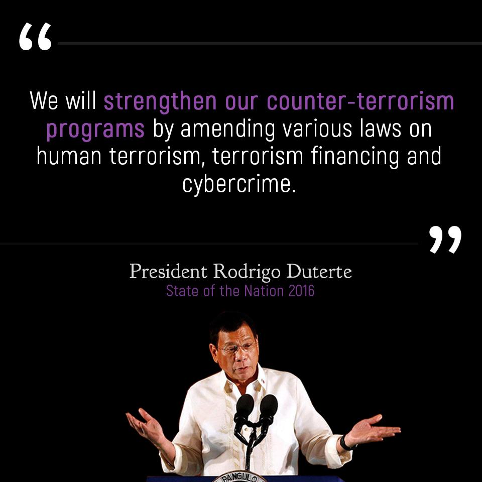 In his first SONA, Duterte vowed not only to “crush” the terrorist group Abu Sayyaf, but also to “strengthen our counter-terrorism programs by amending various laws on human terrorism, terrorism financing, and cybercrime.”