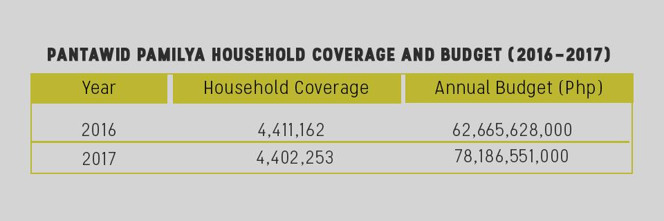 According to the DSWD, as of March 31, 2017, the program covers 41,605 barangays in all 144 cities and 1,483 municipalities in 80 provinces. This year the program targets a reach of 4,402,253 households. Currently, 4,384,638 households or 99.6 percent of the target are part of the program.