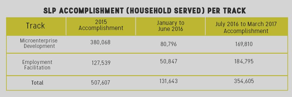 "From July 2016 to March 2017, 354,605 households benefited [from] the program: 169,810 for micro-enterprise development, and 184,795 were facilitated for employment," the DSWD said.