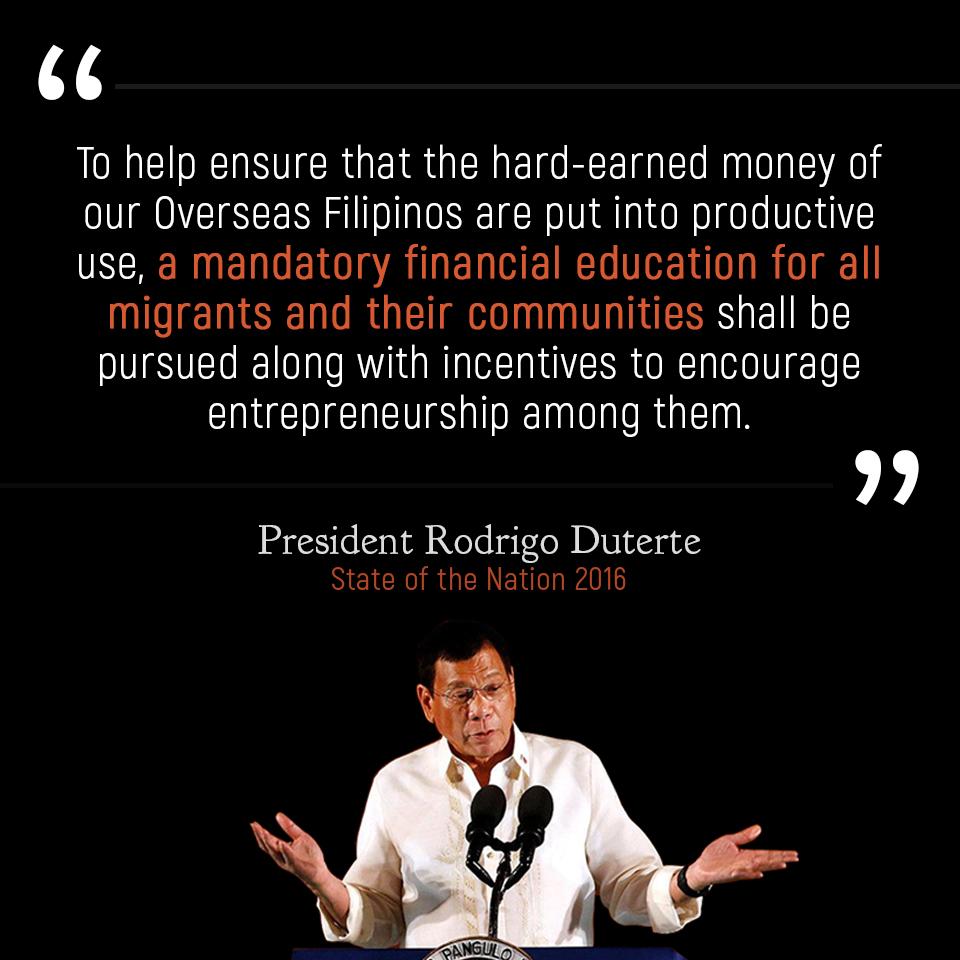 The idea of a financial literacy campaign for OFWs has been mooted for years. In 2013, during the Aquino administration, the Commission on Filipinos Overseas launched PESO Sense, a campaign that "aims to improve the financial acumen of both Overseas Filipinos (OFs) and their beneficiaries."