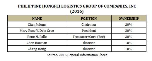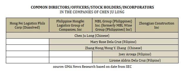 Dela Cruz and Zhang Hong, a Chinese, both appeared in all of Chen’s companies, except in Hong Fei Logistics Phils which was dissolved.