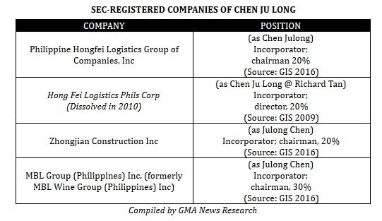 “Chen Ju Long @ Richard Tan” is listed as director of Hong Fei Logistics Phils Corp. with 20 percent ownership in the 2009 General Information Sheet of the company.