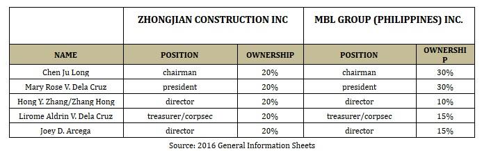 Joey Arcega and Lirome Aldrin Dela Cruz, are listed as officers and stockholders in MBL Group and Zhongjian Construction.