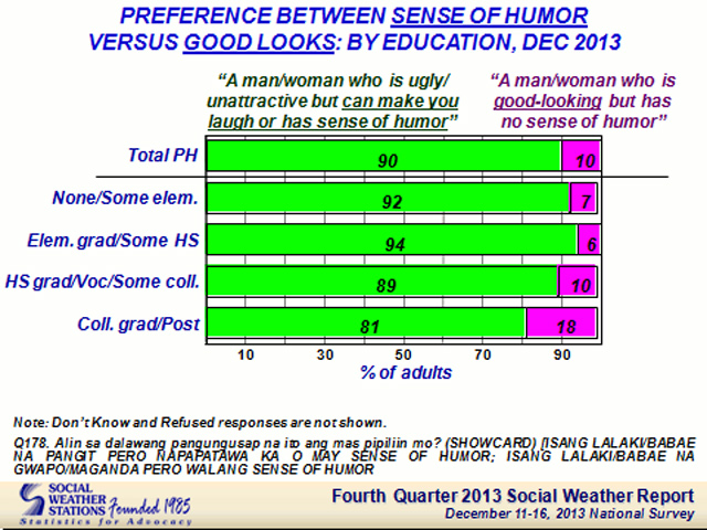 Sa isang survey ng ginawa ng Social Weather Station (SWS), lumitaw na 90 porsiyento ng kanilang tinanong ang pinili ang taong 'di kagandahan o kagwapuhan pero kaya silang patawanan, kaysa sa maganda o pogi pero 'di naman sila kayang pasayahin.