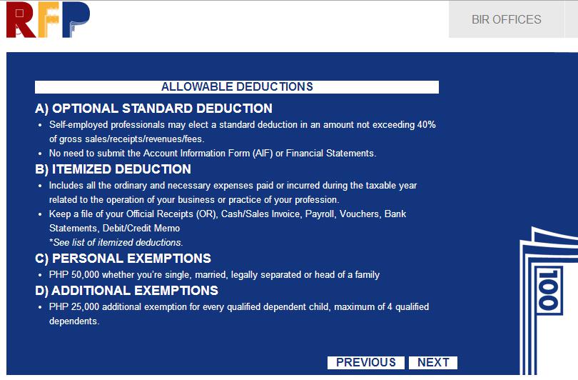 Sa BIR Form 1701 at ayon sa batas (National Internal Revenue Code), ang self-employed ay maaring mag-claim o ibawas sa babayaring tax ang personal exemption na sa ngayon ay nasa P50,000 para sa single o head of the family.