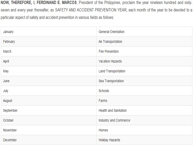 Nakasaad sa nabanggit na proklamasyon ang paglusaw sa naunang ipinalabas na proklamasyon sa safety and accident prevention week, at pinalitan ng safety and prevention year.