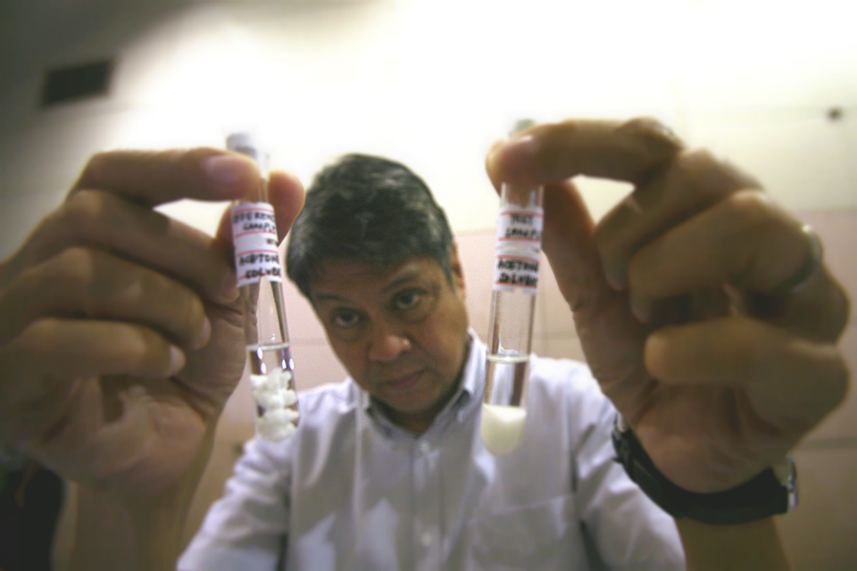 Ipinakita ni Pangilinan ang dalawang vial o test tube. Ang totoong bigas ay hindi nalusaw sa acetone. Hindi nakumpulang ang mga butil at ang ilang butil ay lumutang-lutang pa.