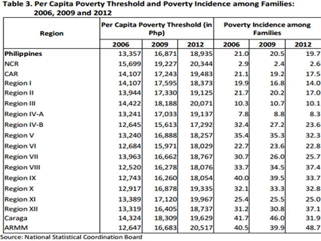 Sa hiwalay na datos mula sa National Statistical Coordination Board (NSCB), lumitaw na ang poverty incidence noon 2009 ay nasa 20.5 percent at 19.7 percent noong 2012.