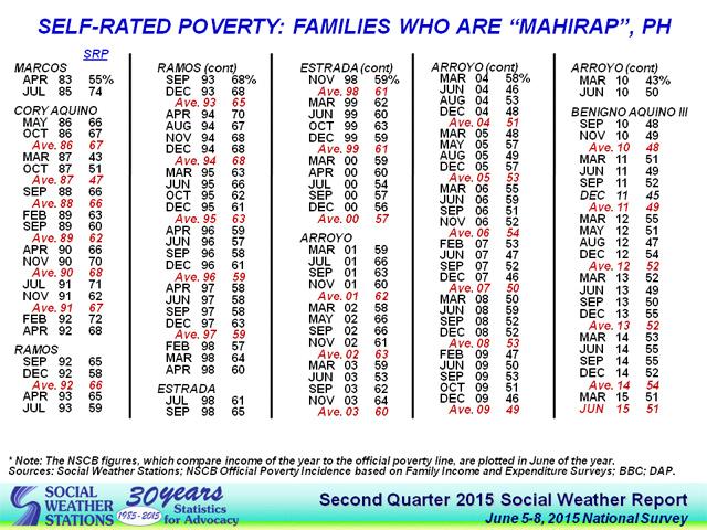 Pagkaraan ng limang taon ng liderato ni Aquino, lumitaw sa pinakahuling tala ng SWS survey na isinagawa nitong June 2015 na 51 percent ang nagsasabing mahirap sila. -- FRJ, GMA News