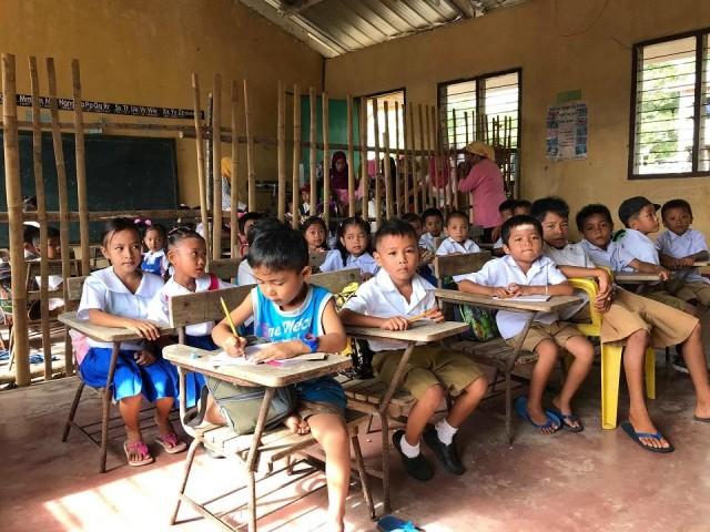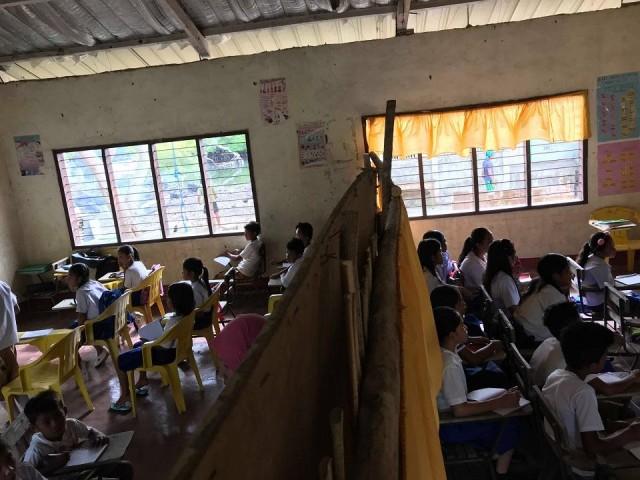 Kinder, Grade 1 at Grade 2 sa isang silid at Grade 3 hanggang Grade 6 naman sa pangalawang silid. Ang isang upuan ay pinagkakasya sa dalawa hanggang tatlong bata. Sa kabila ng kondisyong ito ay makikita sa mga bata ang kagustuhang makapag-aral. Lahat ay aktibong nakikiisa sa unang araw ng klase.
