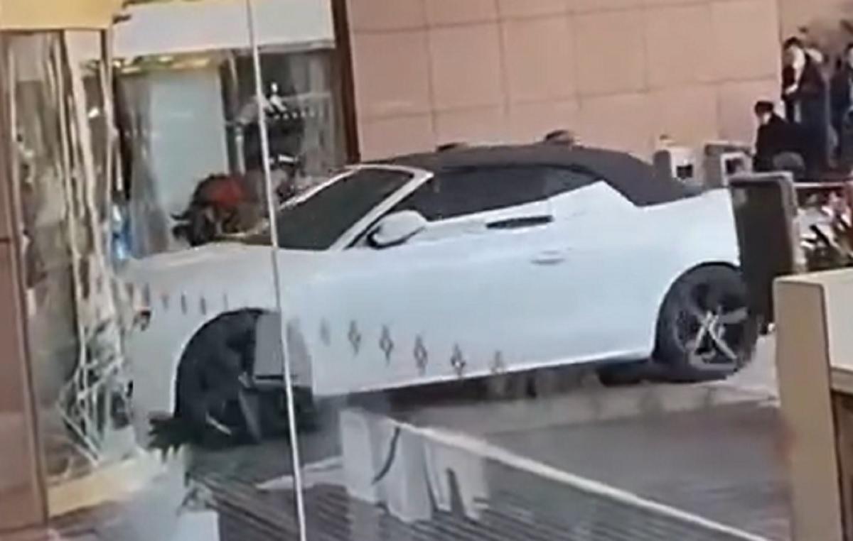 The car crashed into another set of doors before apparently heading for the exit, only to slam into a door frame and come to a stop, its hazard lights flashing.