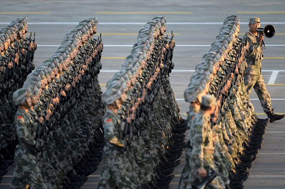 An officer (right) gives instructions as People's Liberation Army (PLA) soldiers march in formation at Tiananmen Square during a rehearsal ahead of a military parade to mark the 70th anniversary of the end of World War II, in Beijing, China on Thursday, September 3. Reuters