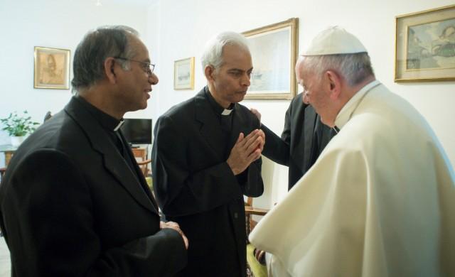 Salesian Missionary Father Thomas Uzhunnalil, kidnapped by militants in Yemen on March 2016 and released after 18 months of captivity met Pope Francis at the Vatican, September 13, 2017. Osservatore Romano/Handout via REUTERS