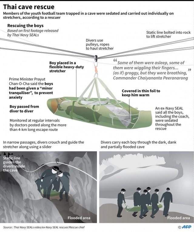 The 12 boys rescued from a Thai cave were passed "sleeping" on stretchers through the treacherous passageways, a former Thai Navy SEAL told AFP on July 11, giving the first clear details of an astonishing rescue mission that has captivated the world.