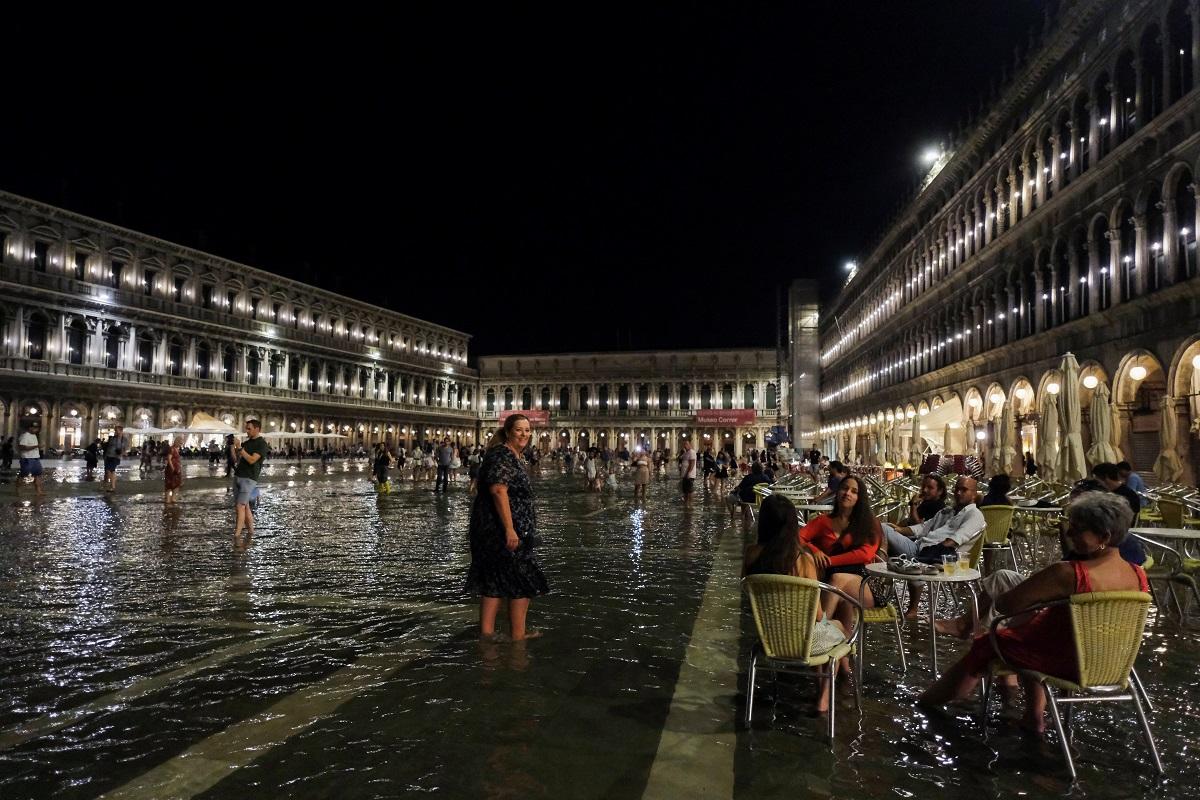 Sunday night's event was less damaging, however, and couples in the square danced to piano music almost knee deep in the water, while children splashed and paddled and tourists waded through, shoes in hand.