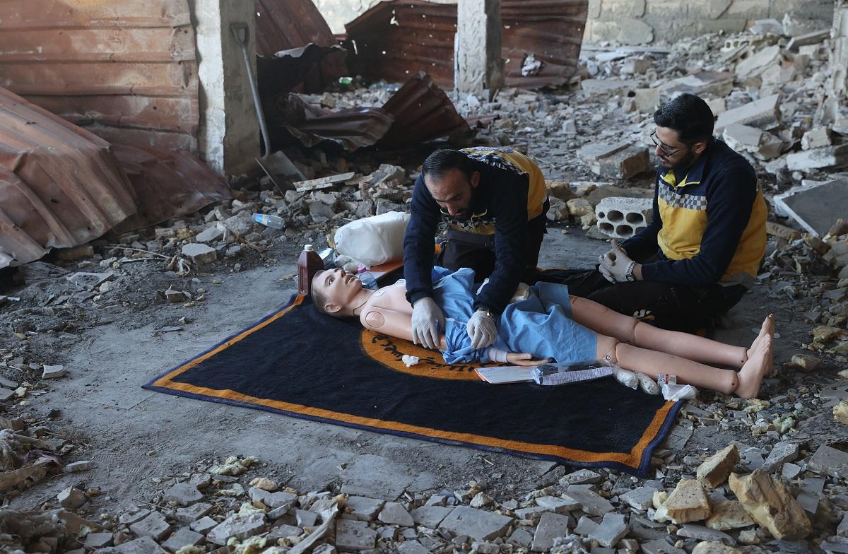Using a dummy, members of Syria's "White Helmets" civil defense force demonstrate how to apply bandages and tourniquets in a clip shot in the rebel-held town of Ariha in Idlib province where Russian airstrikes are relatively routine.