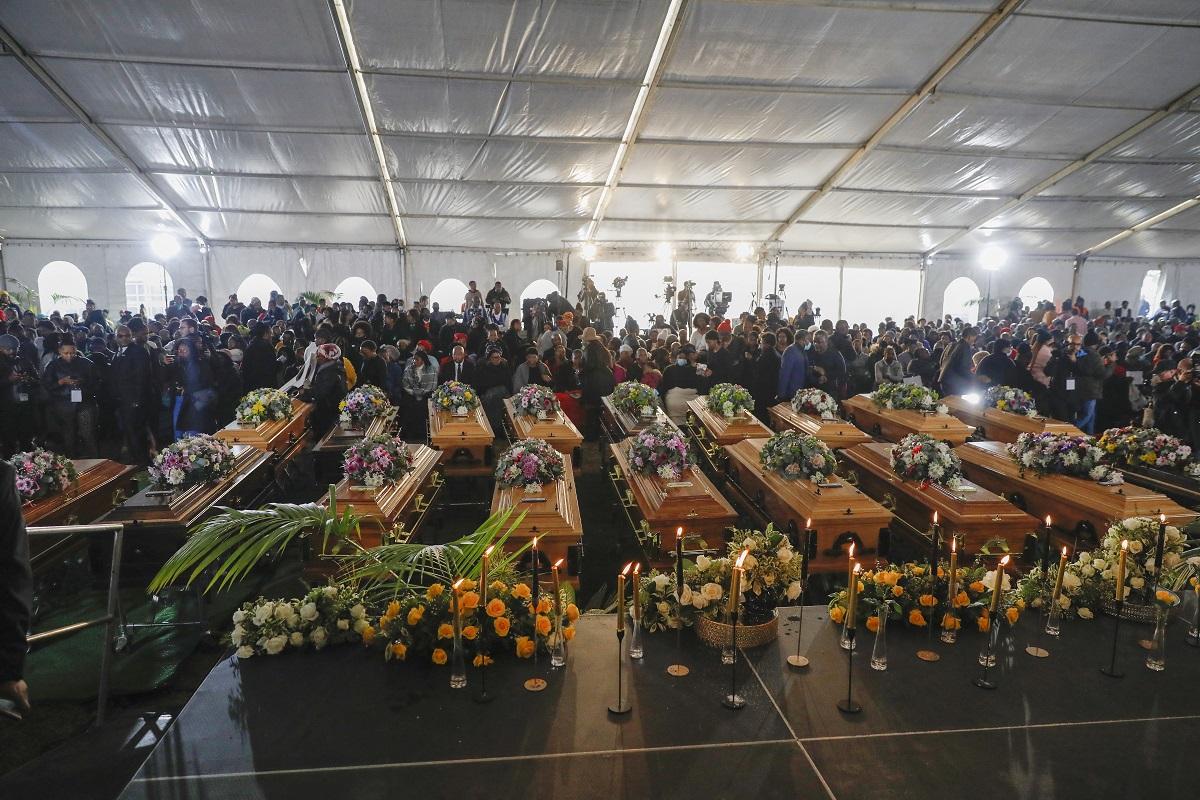 Scores of mourners filled a large marquee where 19 coffins were laid out, and hundreds more people gathered outside to follow the ceremony.