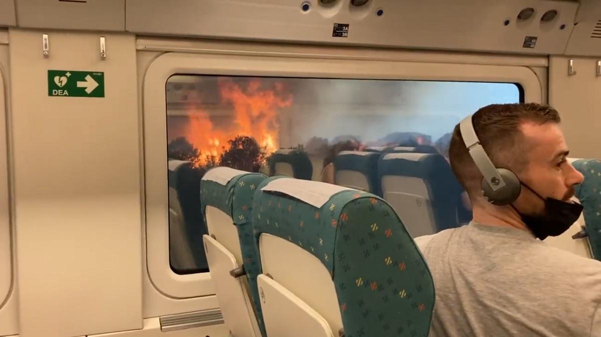 The train was travelling between Madrid and Ferrol in the Galicia region but the Zamora wildfire forced it to a halt at around 9:30 a.m., the passenger who shot the video, Francisco Seoane said.