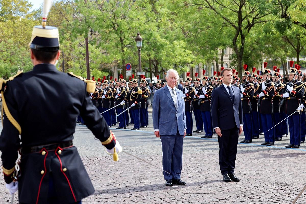 The king and his wife, Queen Camilla, were greeted by French Prime Minister Elisabeth Borne in a windy Paris, before heading off to a ceremony at the Arc de Triomphe, where both nations' air forces will be conducting a flypast.